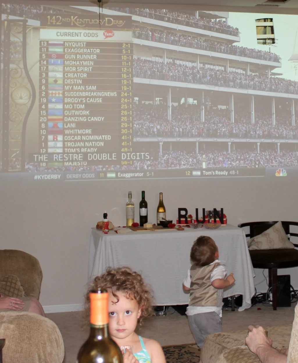Derby line-up, a wine bottle, and toddlers. Perfect party.
