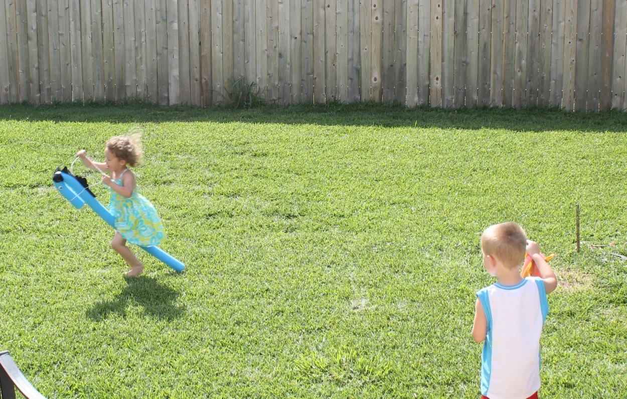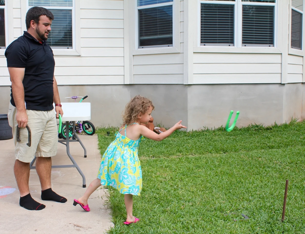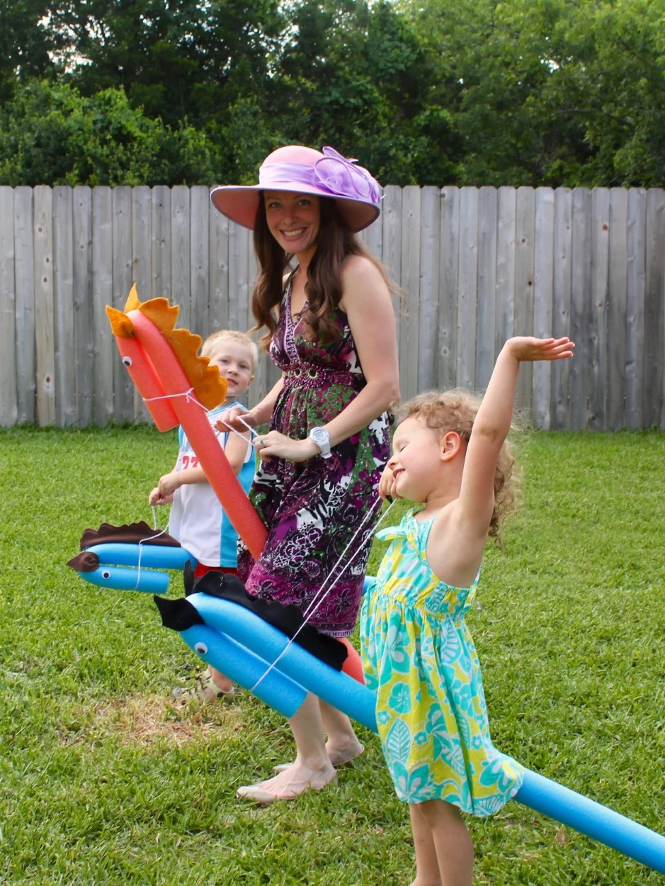 It was a somewhat cloudy, somewhat hot day in Austin, but we managed to toss a few horseshoes and watch the kids race around the backyard on pool noodle ponies. I'm no good with a sewing machine (yet - I have pipe dreams), so the hot glue & pool noodle option worked best for crafting "stick horses" - and they proved a big hit!
