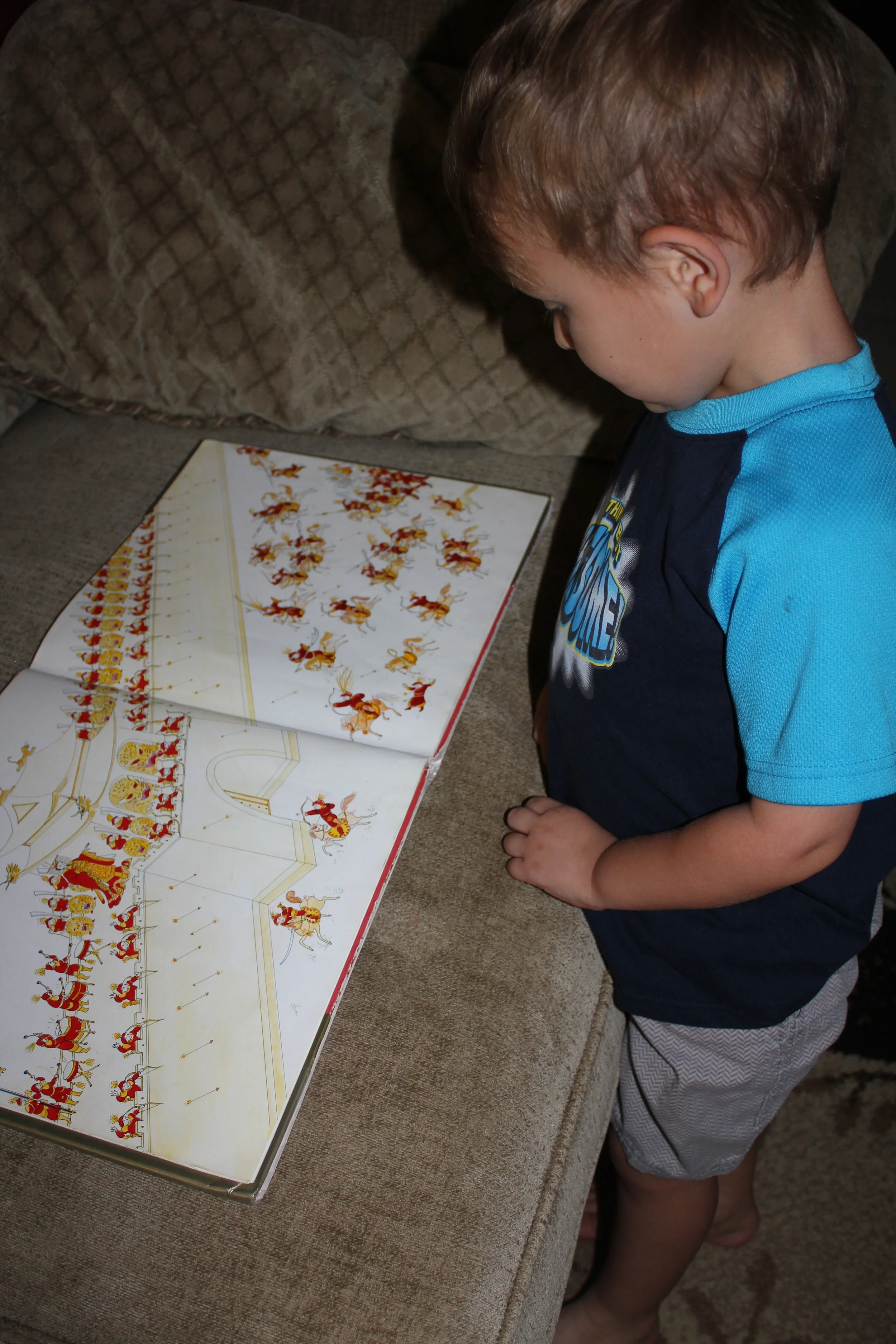 Our journey commenced despite this hurdle, with Nine-In-One Grr! Grr! told by Blia Xiong, adapted by Cathy Spagnoli, illustrated by Nancy Hom and Dragon Kites and Dragonflies adapted and illustrated by Demi. Nine-In-One, “a folktale from the Hmong people of Laos” is one we have enjoyed before, with almost patchwork illustrations highlighting a humorous tale of repetition and forgetting. Demi’s The Empty Pot is a favorite of mine, and one of the two we are searching to find. Her Dragon Kites and Dragonflies proved an acceptable substitution, the pictures nearly telling the rhymes for her! Judah could have spent hours viewing the horseback charge against a fortified city, while Kenzie loved the whimsy and freedom of the kites found throughout.