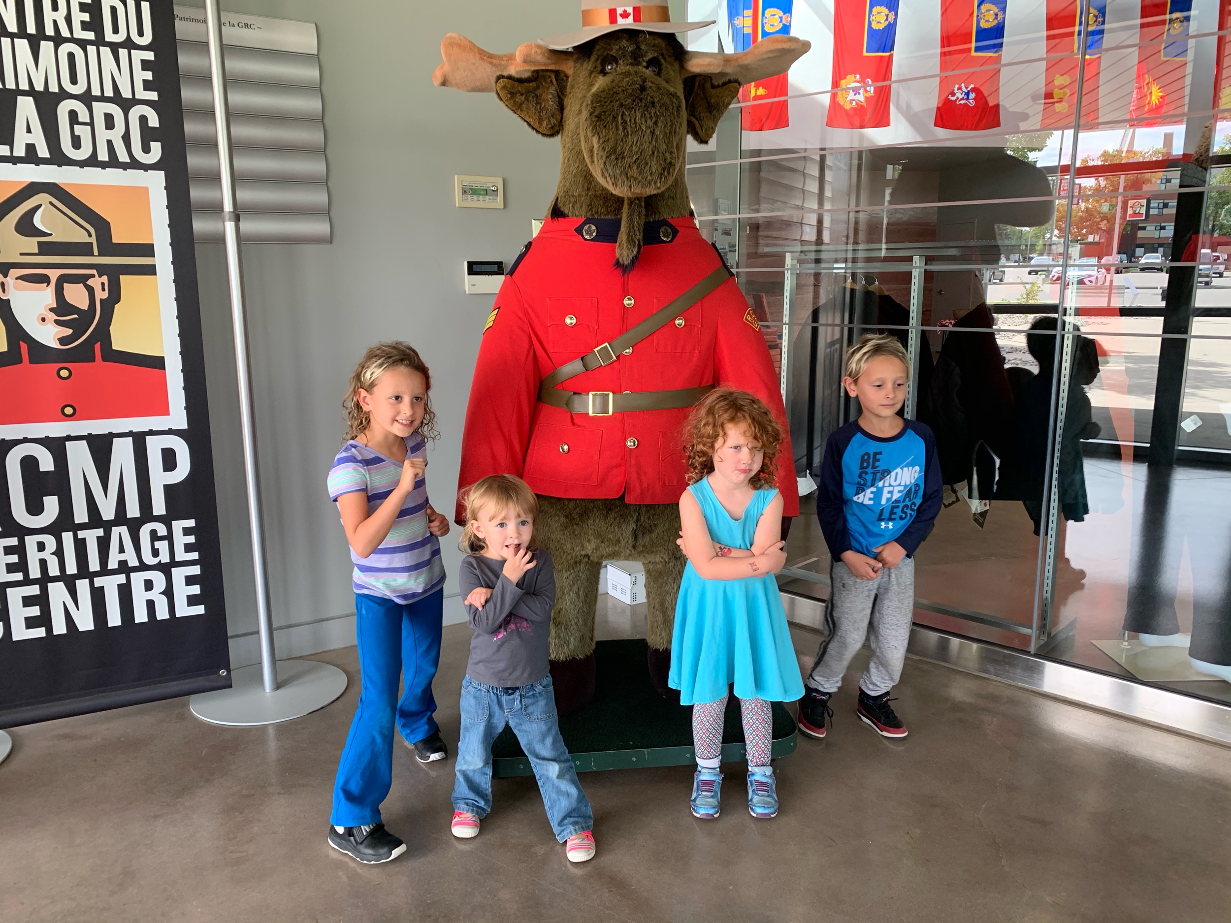 So naturally while I was taking photos of the kids outside the museum a car pulled over and out hopped a woman offering to take our photo. With my back to her I had no idea what to expect and so when I turned around the RCMP badge on her hip gleamed in the sun. On her way off site from a workout, this civilian dressed Mountie offered to take our photo. Alaina’s wish had come true.